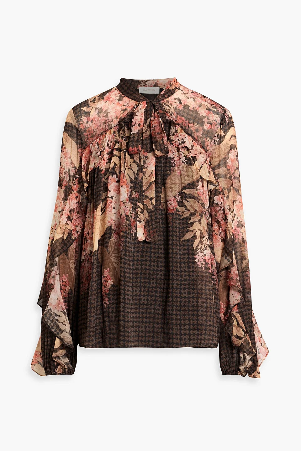 Blouse printed chiffon ruffled pussy-bow elasticated cuffs slips on partially lined lightweight, non-stretchy fabric dry clean imported There's so much to love about this dreamy blouse from Zimmermann. Made from chiffon with a beautiful floral-print and ruffled trims, it’s perfect for adding a touch of elegance to any outfit. We like it with tailored shorts and mules. 100% Viscose Product Code 46376663163122223