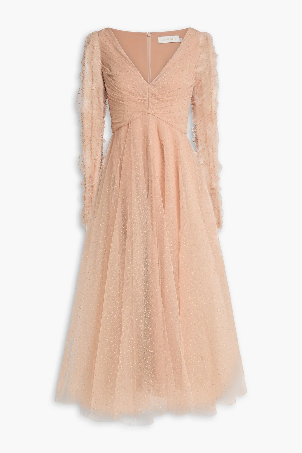Dress tulle glittered pleated ruched sleeves zipped cuffs concealed zip fastening along back partially lined lightweight, non-stretchy fabric dry clean imported Zimmermann’s midi dress will stun at your next event. Made from glittered tulle, it has ruched, sheer sleeves and a full skirt that's ready to twirl. Wear it with strappy heels and a clutch for a fabulous look. 100% Polyester Product Code 46376663162931637