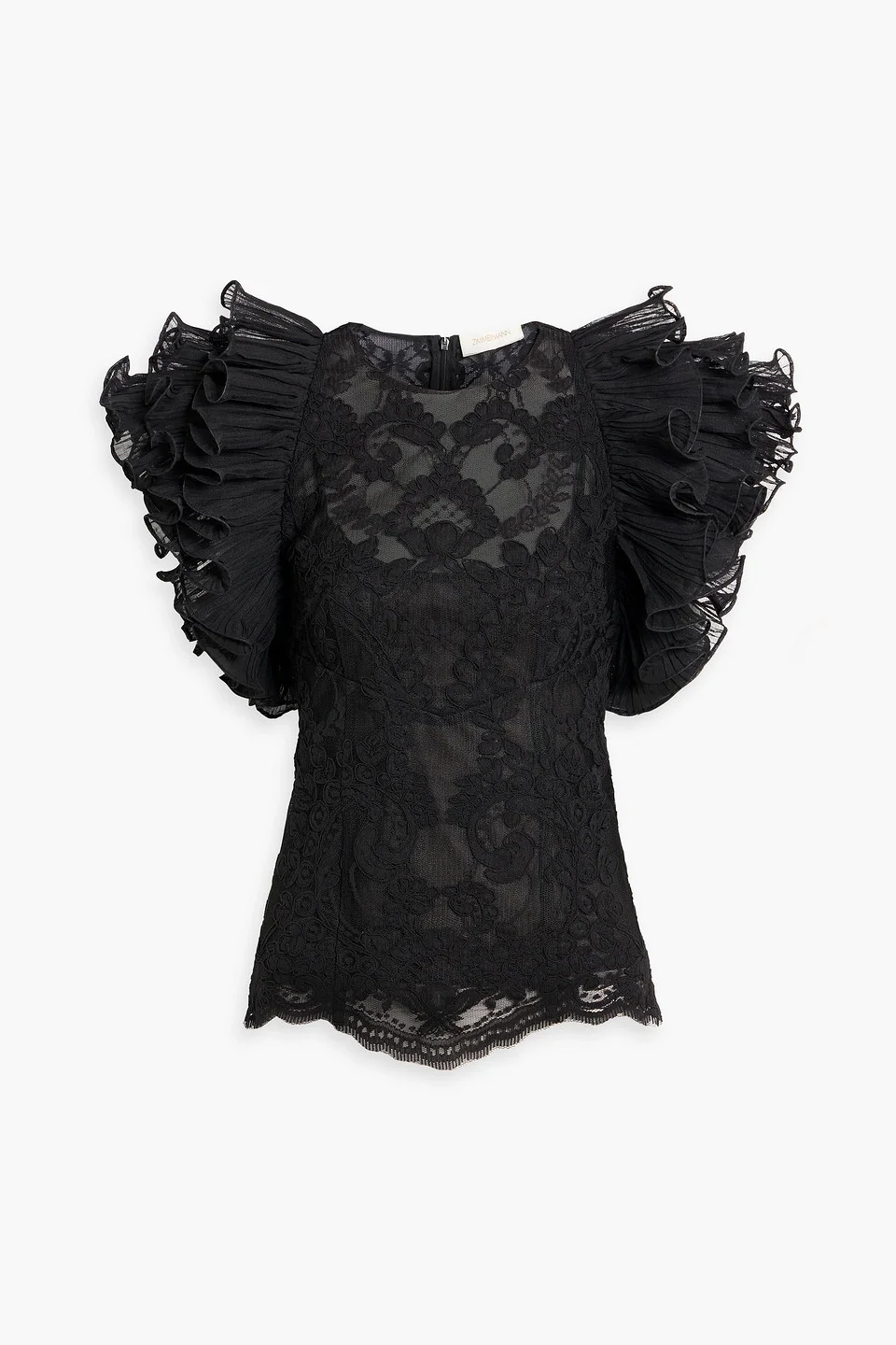 Top corded lace ruffled sleeves concealed zip fastening along side camisole to line mid-weight, non-stretchy fabric dry clean imported Here for the frills ? You're going to love Zimmermann's flouncy top. Cut from black corded lace in a slim shape, it shows off voluminous ruffled sleeves. Pair with a leather skirt, wide-leg pants or denim. 100% Polyester Product Code 46376663163122701