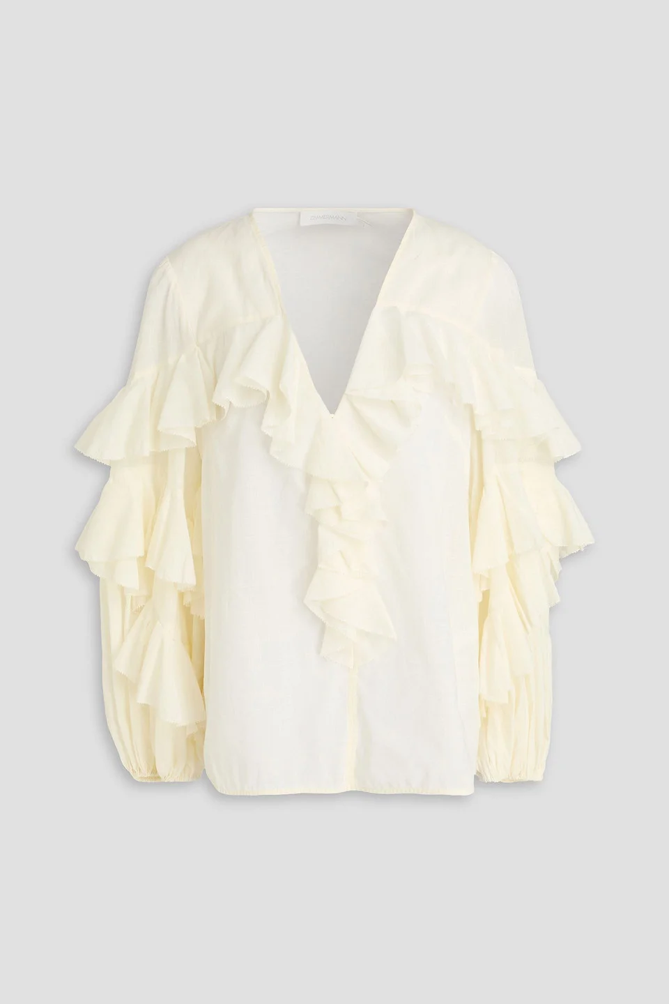 Blouse cotton ruffled elasticated cuffs concealed button fastenings along front mid-weight, non-stretchy fabric dry clean imported Zimmermann’s ultra-femme blouse can be worn in so many ways and in every season, too. It’s cut from ecru cotton with cascading ruffles. We like it with tailored shorts, polished skirts and refined denim. 100% Cotton Product Code 46376663163054996