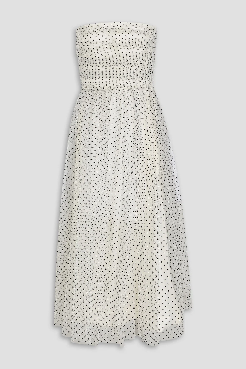 Strapless dress polka-dot tulle flocked ruched detachable shoulder straps concealed hook and zip fastening at back internal boning lightweight, non-stretchy fabric dry clean imported 100% Polyester Product Code 1647597358610018