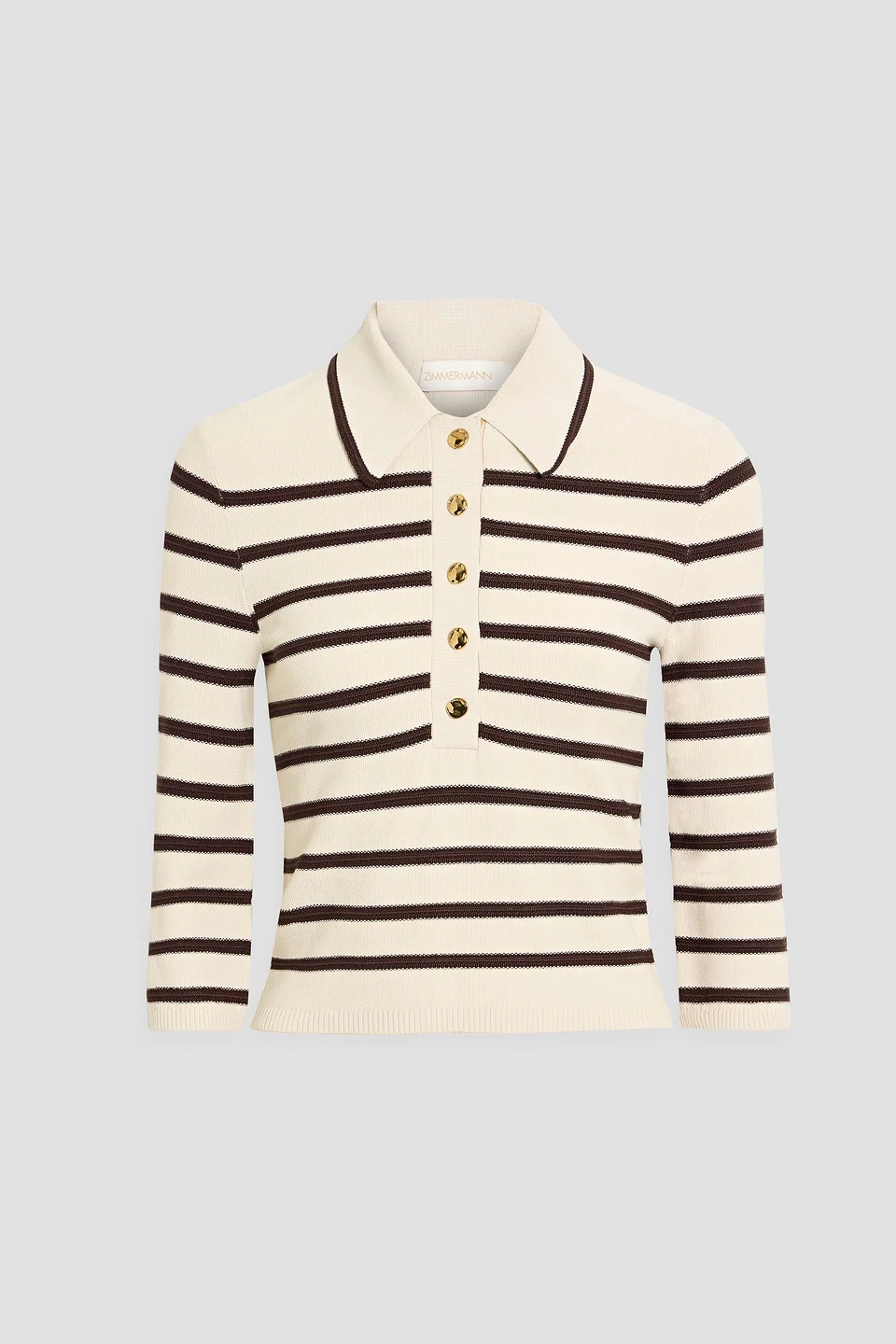 Polo shirt striped knitted button fastenings along front mid-weight knit dry clean imported Zimmermann's striped polo shirt will add a touch of polish to any look. It's made from a mid-weight knit with a tidy collar and gleaming gold-tone buttons. Pair with everything from the coordinating skirt to denim. 87% Viscose 12% Polyamide 1% Elastane Product Code 46376663163122370