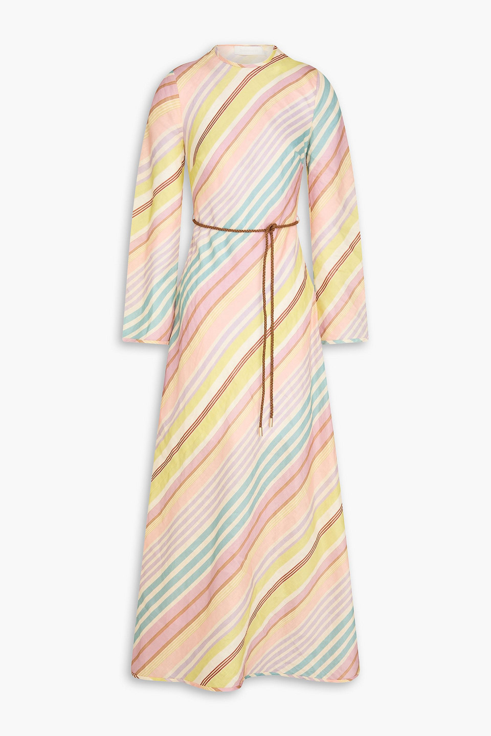 Dress striped linen detachable waist tie concealed zip fastening along shoulder mid-weight, non-stretchy fabric dry clean imported Looking for a really great addition to your summer wardrobe? Zimmermann's maxi dress is made from linen and features a stylish striped pattern with a detachable waist tie. Wear it with sandals and delicate jewelry. 100% Linen Product Code 46376663162914407