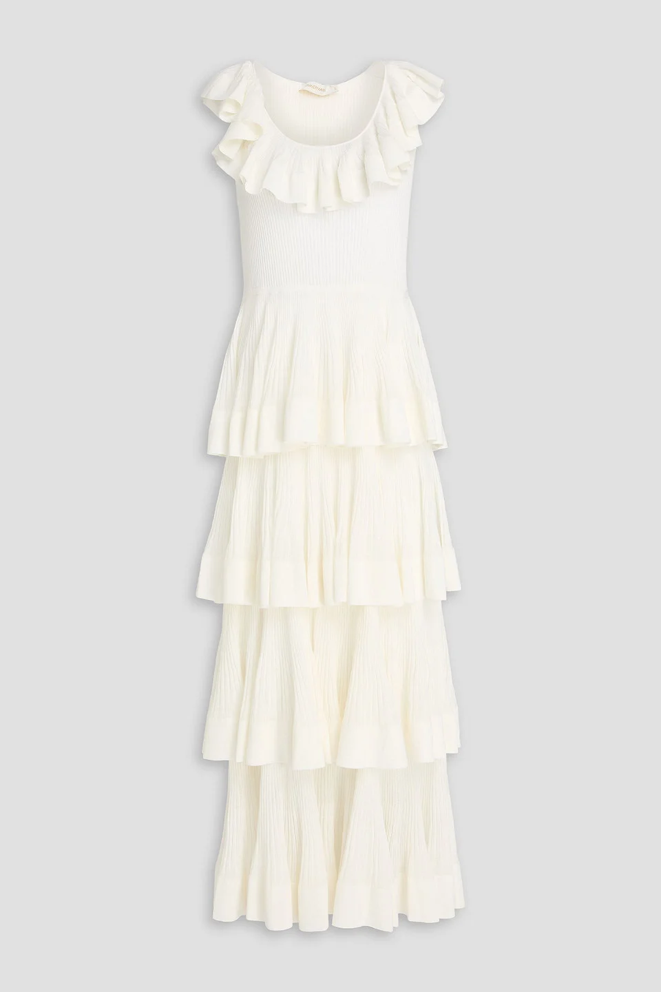 Dress cotton-blend ribbed tiered slips on lightweight knit dry clean imported Here for the frills ? Zimmermann’s ivory maxi dress is made from a lightweight cotton-blend with tiers of femme ruffles. We like it with neutral sandals and a woven tote. 65% Cotton 35% Polyamide Product Code 46376663162935490