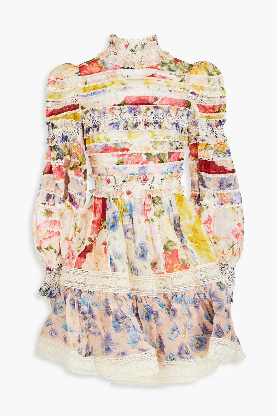 Dress floral-print gauze linen and silk-blend tiered lace trims smocked trims ruffled concealed zip fastening along back partially lined lightweight, non-stretchy fabric dry clean imported Zimmermann’s ‘Flora’ mini dress is pure delight. Made from a lightweight linen and silk-blend, it showcases a charming floral print with ruffled and tiered details. Wear it with strappy sandals for brunch or a garden party. 53% Linen 47% Silk Product Code 1647597342393798
