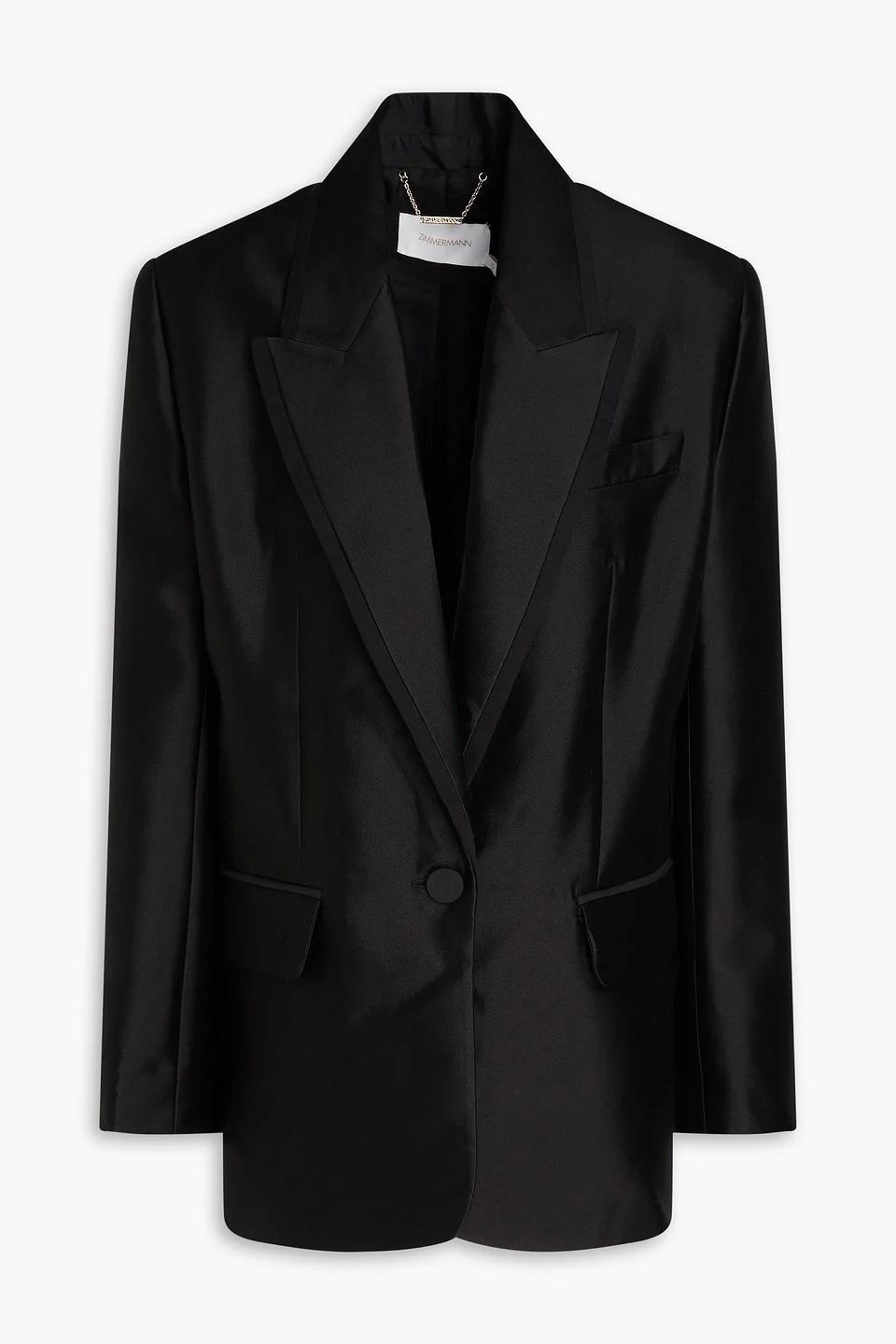 Blazer wool and silk-blend shoulder pads grosgrain trims buttoned cuffs breast pocket front flap pockets button fastening at front fully lined mid-weight, non-stretchy fabric dry clean imported Looking for a really great addition to your evening wardrobe? Zimmermann's blazer is made from a wool and silk-blend, complete with shoulder pads and grosgrain-trimmed peak lapels for a polished look. Wear it with tailored trousers or a slinky dress. 53% Wool 47% Silk Product Code 1647597358969153