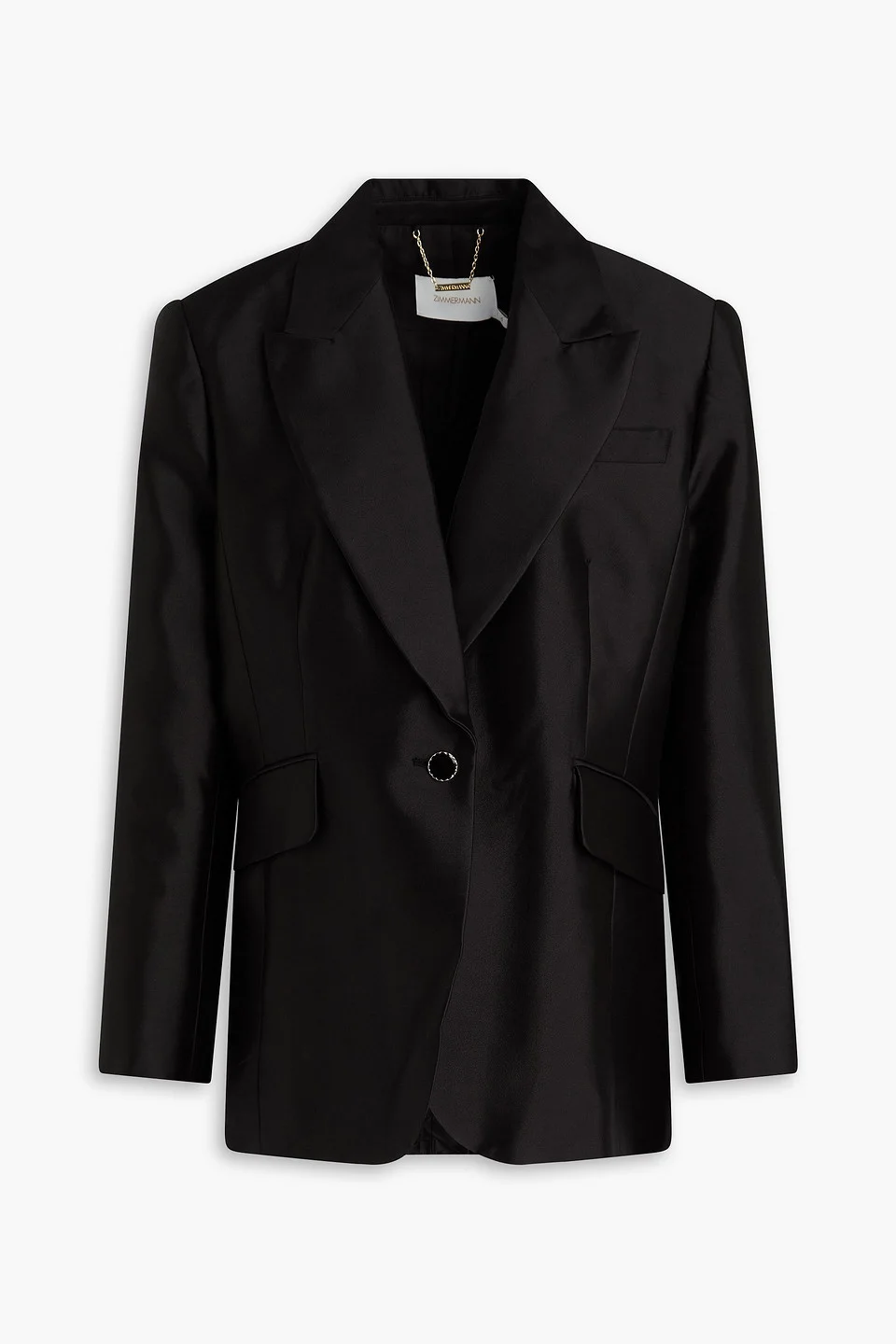 Blazer satin wool and silk-blend shoulder pads breast pocket front flap pockets button fastening at front fully lined mid-weight, heavily embellished fabric dry clean imported Meet Zimmermann’s stunning blazer, a must-have for your wardrobe. Made from a wool and silk-blend, it has shoulder pads and a single button front for a polished look. Wear it with tailored trousers and heels for an ultra-chic look. 52% Wool 48% Silk Product Code 46376663162933961