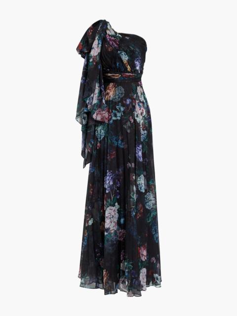 One-shoulder pleated floral-print chiffon gown