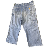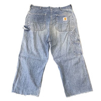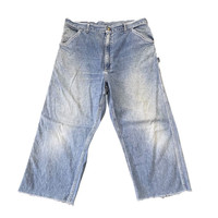 About the Item • Designer: Carhartt • Era: Likely 1990s/Early 2000s (based on the YKK zipper and "53" button stamp) • Style: Double-stitch carpenter pants with hammer loop and tool pockets. • Condition: Pre-owned/Vintage. Featuring a heavy, natural light-wash fade and custom raw-cut hems. Sturdy YKK zipper and Carhartt branded brass hardware. Description Vintage Carhartt Carpenter Pants - Sun Bleached & Cropped Elevate your workwear rotation with these perfectly faded Carhartt carpenter jeans. These feature a heavy, light-wash patina that only comes with years of authentic wear. They have been custom-cropped with a raw hem for a modern, boxy silhouette that sits perfectly over boots or high-top sneakers. Features: • Classic 7-pocket carpenter styling with hammer loop. • Heavyweight denim in a beautiful "sun-bleached" light blue. • Authentic vintage details: Branded brass button (back stamped 53) and YKK brass zipper. • Raw edge hem for a distressed, streetwear aesthetic. Condition: Excellent vintage condition with natural fading and minor fraying at the hem as shown. Measurements: Waist 17 Hip 13 Knee 11 Leg Opening 10 Inseam 22 Front Rise 14 SKU : MIX45