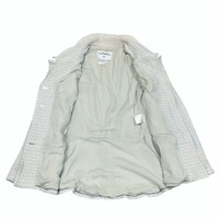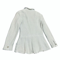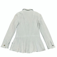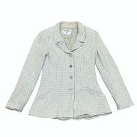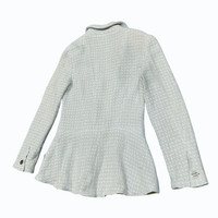 Karl Lagerfeld for Chanel This piece hails from the legendary tenure of Karl Lagerfeld, who reimagined Gabrielle "Coco" Chanel's classic silhouettes for the modern woman. Under his direction, the Cruise (Resort) collections became a hallmark of effortless luxury. This specific 2000 collection (00C) captured the optimism of the new millennium, blending traditional French craftsmanship with the fresh, clean aesthetic of the early Y2K era. Overview Elevate your wardrobe with this quintessential piece of fashion history. This authentic Chanel tweed jacket from the Spring 2000 Cruise Collection is rendered in a stunning sky-blue hue. Featuring a classic collarless design and a subtle peplum flare, it perfectly balances structured tailoring with feminine softness. Details • Brand: Chanel • Collection: 00C (Cruise 2000) • Model No: P14905V08235 • Color: Pastel Sky Blue • Material: Signature Wool/Cotton Tweed (Bouclé) • Hardware: Original silver-tone "CHANEL PARIS" embossed buttons • Condition: [Excellent vintage condition with minimal signs of wear] Measurements (Laying Flat) • Size: FR 36 • Shoulder to Shoulder: [15inches] • Bust (Armpit to Armpit): [17”] • Sleeve Length: [22”] • Total Length: [23.5”] Authenticity Note This item is 100% authentic. The internal "Chanel Boutique" tag, composition tag, and CC silk lining are all intact and verified. SKU : MIX45