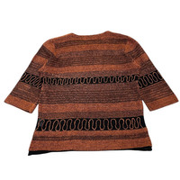 About the Designer Lancel Paris is a historic French luxury house founded in 1876 by Angèle Lancel. While primarily famous for high-end leather goods and handbags (like the iconic "Premier Flirt"), the brand expanded into ready-to-wear through various licensing agreements, particularly in Japan during the 1980s and 90s. This specific piece was produced by Fukusuke Corporation, a respected Japanese textile manufacturer, blending Parisian chic with high-quality Japanese garment construction. Product Description Elevate your vintage collection with this sophisticated Lancel Paris lightweight knit top. Featuring a rich palette of bronze, copper, and black, this piece showcases a unique horizontal stripe arrangement accented by playful "squiggle" embroidery. The fabric has a subtle metallic sheen, making it perfect for transitioning from a polished day look to an elegant evening outfit. Crafted in Japan under the Lancel Paris license, it offers the exceptional quality and attention to detail synonymous with Japanese manufacturing. • Brand: Lancel Paris • Origin: Made in Japan (Fukusuke Corp) • Material: 95% Polyester, 5% Nylon (Lightweight, breathable knit) • Color: Bronze / Copper / Black • Condition: Excellent vintage condition. • Style: 3/4 Sleeve / Crew Neck / Relaxed Fit Measurements (Flat Lay) • Pit to Pit (P20): 20 inches • Length (L23.5): 23.5 inches • Shoulder (S15.5): 15.5 inches • Sleeve Length (SL15.5): 15.5 inches SKU : MIX46