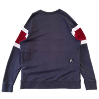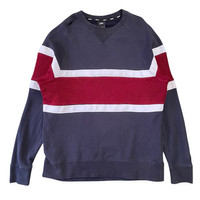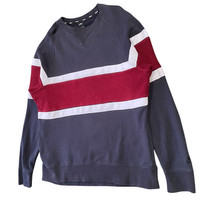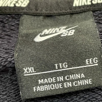 This is an authentic sweatshirt from Nike Skateboarding (Nike SB), the division of Nike dedicated to the skateboarding culture and apparel. Nike SB products are known for their comfort, durability, and blend of athletic performance with street style. • Design/Style: A classic crewneck sweatshirt with a color block design. It features a dark navy blue/charcoal body with a prominent burgundy/red terry cloth stripe across the chest and shoulders, separated by sharp white stripe accents. • Construction: The sweatshirt has raglan sleeves, which are cut diagonally from the neckline to the underarm, providing a relaxed, athletic fit and a distinctive look. The back features a small woven label patch with the Nike SB logo. • Branding: Subtle black-on-black embroidered NIKE SB logo detail is located on the left cuff. The inner tag indicates it is made from a blend of 100% Cotton body with a rib of 98% Cotton/2% Spandex. • Perfect for: Skateboarding, streetwear enthusiasts, fans of early 2000s/Y2K athletic aesthetic, or comfortable, casual wear. 📏 Size & Measurements The size tag indicates XXL (International size, as seen on the Indonesian tag), but it measures smaller than a typical modern XXL. Please use the measurements for an accurate fit. This item fits approximately like a Men's Large (L) or a fitted XL. Please compare the provided measurements to a garment you already own.