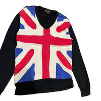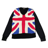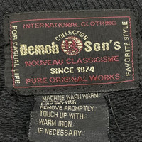 • Brand: Demob Son's (Collection International Clothing) • Established: SINCE 1974 • Style Note: NOUVEAU CLASSICISME, PURE ORIGINAL WORKS, FAVORITE STYLE • Country of Origin: 日本製 (MADE IN JAPAN) • Material Composition: 綿 100% (100% Cotton) • Product No./Ref.: K 1563 Product Description Rare Vintage Demob Son's Union Jack Sweatshirt - Made in Japan This is a fantastic and rare vintage black V-neck sweatshirt from the Japanese brand Demob Son's (established 1974), known for its unique, rock-inspired, and classic rework designs. Design Details: • Prominent Union Jack: The front features a striking, large appliqué design of the Union Jack (Flag of the United Kingdom). The flag is constructed from dimensional, multi-textured fabric panels (white, red, and blue) sewn onto the front body panel. • Color and Style: The main body and sleeves are black. It features a V-neck cut and a classic sweatshirt fit with ribbed cuffs and hem. The construction is distinctly high-quality, typical of Japanese-made vintage garments. • Fit: The piece has a unique vintage silhouette, blending a classic sweatshirt with a striking graphic statement. Condition: Excellent vintage condition. The black cotton material is soft and shows minimal wear, and the Union Jack appliqué remains vibrant and securely attached. Sizing: The garment is not explicitly tagged with a size (e.g., S, M, L) but based on the measurements, it fits like a Men's Medium/Large or Women's Large/XL (please verify with measurements). Materials & Care: • 100% Cotton (綿 100%) • Care Notes (Japanese Translation): Do not leave wet for long periods or use bleach-containing detergents. Avoid tumble drying. Do not iron directly on the print or flocking parts. MEASUREMENTS (Approximate Lay-Flat Inches):