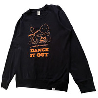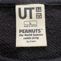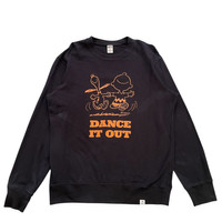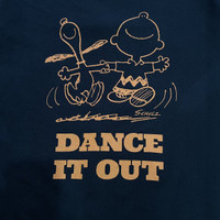 Iconic and Energetic UNIQLO UT Peanuts Sweatshirt! This popular crewneck features a joyful graphic of Charlie Brown and Snoopy dancing together, rendered in a warm, distressed orange line art. Below the dancing duo is the bold, positive slogan: "DANCE IT OUT." The sweatshirt is a deep, solid Dark Blue or Black/Navy color, providing a great contrast to the graphic. It is a licensed Peanuts product from Uniqlo's high-quality UT line, dated \copyright 2021. It is tagged as a size Large (L) and is made from a comfortable and breathable 100% Cotton body (with a cotton/poly blend in the ribbed cuffs/hem). This piece is perfect for adding a bit of cheerful nostalgia to your casual wardrobe. the measurements (in inches, assuming a standard flat lay): • P24 (Pit to Pit / Chest Width) • L29 (Length) • S21 (Shoulder Seam to Shoulder Seam Width) • SL25 (Sleeve Length from shoulder seam)