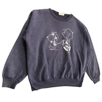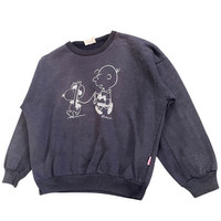 • Brand: Club Victory • Designer/License: Peanuts (Charles M. Schulz) • Era: Likely 1980s or early 1990s based on the tag style and "Made in Waterloo, Canada" which is common for vintage Canadian sportswear brands of that time. • Material: 50% Cotton, 50% Polyester (a classic, comfortable blend often used in vintage sweats). • Manufacturing Location: Made in Waterloo, Ontario, Canada. A rare and charming find for any Peanuts collector! This vintage crewneck sweatshirt is from the Canadian brand Club Victory and features an iconic Peanuts graphic. The design shows a slightly distressed, off-white line drawing of Charlie Brown holding Snoopy on a leash, while Snoopy is playfully standing up and appearing to "air guitar" a stick or object. This is a unique and less common graphic, signed by Schulz. The sweatshirt is a dark charcoal grey/navy blue, made from a cozy and comfortable 50% Cotton, 50% Polyester blend. It features a classic, slightly boxy vintage fit with long sleeves. The original tag clearly indicates it was Made in Waterloo, Ontario, Canada, and is marked as a size Small / Petite. Condition: Good vintage condition with expected fading and wear for its age, giving it a soft, worn-in feel and a great vintage look. Please check the provided measurements for the best fit, as vintage sizing can vary. The measurements : • P24.5inc (likely Pit to Pit / Chest Width) • L23inc (likely Length) • S26inc (likely Sleeve Length from collar/neck seam) • SL17inc (likely Sleeve Length from shoulder seam)