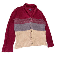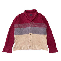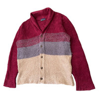 About the Designer Sergio Tacchini is a legacy Italian sportswear brand founded in 1966 by the professional tennis player of the same name. While famous for its presence on the tennis court (worn by legends like John McEnroe and Novak Djokovic), the brand became a staple of European "Casual" subculture and 90s street fashion. This specific piece is a Japanese-market licensed garment (manufactured by Moririn Co., Ltd.), known for blending Italian aesthetic heritage with high-quality Japanese textile standards. Description Step up your cozy game with this authentic Sergio Tacchini color-blocked cardigan. Featuring a unique, high-pile "shaggy" texture similar to mohair or sherpa fleece, this piece offers a bold three-tone palette of deep burgundy, charcoal grey, and sandy beige. The cardigan features a classic shawl-style collar and branded hardware buttons, giving it a sophisticated yet relaxed "grandpa sweater" silhouette. Perfect for layering in cold weather or as a statement piece for a retro-streetwear look. • Brand: Sergio Tacchini (Licensed by Moririn Co., Ltd.) • Material: 100% Polyester (Soft, fleece-like knit) • Condition: Great vintage condition. No major flaws. • Made in: China (Japanese Market Release) Measurements (Inches) • Pit to Pit (P23): 23” • Length (L26): 26” • Shoulders (S21.5): 21.5” • Sleeve Length (SL25): 25” SKU : MIX45