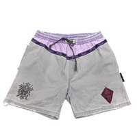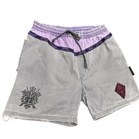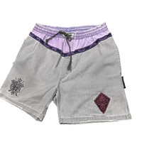 Vintage 90s Wave Buster Canvas Surf Shorts Step back into the 90s skate and surf scene with these authentic Wave Buster shorts by Orange Gal Products. Made in California, USA, these shorts feature a heavy-duty grey canvas body with a vibrant purple elastic waistband and a unique tribal-inspired gothic logo. The raw-edge hem and "Wave Buster" embroidery give them that perfectly worn-in, grunge-skater aesthetic. • Brand: Wave Buster (Orange Gal Products) • Era: 1990s • Origin: Made in California, USA • Features: Elastic drawstring waist, contrast trim, tribal patch details, rear pocket, and raw-cut hems. • Condition: Excellent vintage condition with a desirable natural fade. 💡 About the Designer/Manufacturer Orange Gal Products was a California-based apparel company active in the late 80s and 90s, specializing in durable, "action-sports" lifestyle clothing. Their Wave Buster line specifically targeted the surf and skate subcultures, known for using heavy cotton canvas and bold, alternative graphics (like the gothic lettering and tribal motifs seen here) that stood out from the brighter, neon surf brands of the era. Flat Measurements (Inches): • Waist: 16" (Unstretched) • Thigh: 13" • Inseam: 5.5" • Front Rise: 12.5" • Leg Opening: 11" SKU : MIX45