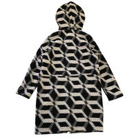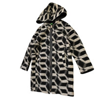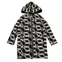 Brand History: Founded in 1965 in Ponzano Veneto, Italy, by the Benetton siblings (Luciano, Giuliana, Carlo, and Gilberto). The brand became globally famous for its vibrant color palette and its distinctive, often controversial, "United Colors of Benetton" advertising campaigns, which promoted diversity and social awareness. • Style/Aesthetic: Known for knitwear, casual-chic Italian style, and use of bold, contemporary colors and patterns. The brand has a history of high-quality wool and interesting textile designs, which your coat perfectly exemplifies. Make a bold statement this season with this striking United Colors of Benetton Hooded Coat, featuring an incredible black and white Geometric/Optical 3D Cube pattern that truly pops. Crafted from a warm Virgin Wool blend (54% Wool) and fully lined, this coat delivers both high fashion and cozy warmth. The longline design, structured hood, and chic rose gold full-zip closure add a modern touch to this graphic masterpiece. Perfect for adding a maximalist yet monochrome element to any winter or fall wardrobe. This piece is ideal for those who love designer Italian style and head-turning visuals." • Condition: [Insert your item's condition here, e.g., Excellent pre-owned condition, no visible flaws.] • Sizing: Tagged as an Italian size 38, which typically equates to a US Size 2 or UK Size 6. Please rely on the provided flat measurements for the best fit. • Composition: Luxurious 54% Virgin Wool Blend Shell; Smooth Acetate/Viscose Lining. • Measurements (Laying Flat, Inches): • Pit to Pit (P): 21.5" • Length (L): 33.5" (from back of neck to hem) • Shoulder (S): 21.5" (seam to seam) • Sleeve Length (SL): 18" (from shoulder seam to cuff) • Details: High-quality construction, metallic rose gold SAB 7 zipper, side pockets, full hood. • Era/Collection: Identified by code 7.7.6706.0 2UP75K1Q3 38 and manufacturing date reference of 05/2017.