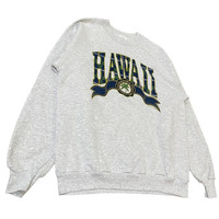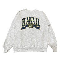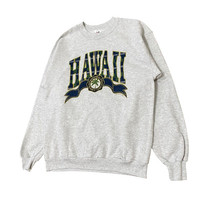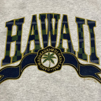 👕 About the Designer/Manufacturer (Tee Jays & RN53750) The RN number RN53750 is associated with Tee Jays, a company founded in 1976 by Terry Wylie and Jim Morris in Florence, AL. • Era of Production: The 1991-2002 period is when Tee Jays used the RN#53750 extensively, aligning perfectly with the 1993 copyright date on the graphic. This places the sweatshirt firmly in the early 1990s vintage era. • Significance: Tee Jays was a major vertical operation that produced blank garments, often for screen printing partnerships with major entities like Disney, Planet Hollywood, and Warner Bros. 🎨 Design Description This is a classic 1990s tourist-style sweatshirt. • Body: Heather Grey/Light Grey, long-sleeved crewneck pullover with a relaxed fit. • Graphic: The main graphic prominently features the word "HAWAII" in large, collegiate-style block letters with a textured fill (some sections appear plaid/checked in green and navy, others are vertically striped). • Banner/Wreath: A navy blue banner/ribbon sits below the main text, edged in gold/yellow, with a central round emblem. • Central Emblem: The emblem features a palm tree in a circle, surrounded by the names of the main Hawaiian islands: MAUI, KAUAI, MOLOKAI, LANAI, OAHU. • Copyright: The bottom right of the graphic shows the copyright "© LAMCO 1993", confirming the design date. 📏 Measurements (Laid Flat, Approx.) The measurements are listed in the order you requested (P, L, S, SL): • P (Pit to Pit/Chest): 22 inches • L (Length/Top of Shoulder to Hem): 27 inches • S (Shoulder to Shoulder): 22.5 inches • SL (Sleeve Length/Shoulder Seam to Cuff): 24 inches