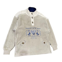 About the Designer Silvy Sportswear is an Italian heritage brand known for blending high-performance technical fabrics with traditional European aesthetic details. Based in Italy, they gained popularity in the 80s and 90s for their premium ski and outdoor leisure wear. This piece features genuine Polartec fabric, which was the gold standard for breathable warmth during that era. Description Embrace a cozy, alpine-chic look with this vintage Silvy Sportswear fleece. Made in Italy, this pullover features a unique cream-and-grey color block design accented by intricate embroidery and ladder-stitch detailing across the shoulders and sleeves. The centerpiece is a beautifully detailed embroidery featuring loons (ducks), floral arrangements, and "SILVY" branding. With its high-quality Polartec construction and unique wood-look buttons, this is a perfect collector's item for fans of vintage gorpcore or cottagecore styles. • Brand: Silvy Sportswear (Walking Silvy) • Material: 100% Polyester (Polartec Fleece) • Origin: Made in Italy • Features: Quarter-button neck, two buttoned hand pockets, reinforced ribbed cuffs, and decorative ladder-stitch trim. • Condition: Great vintage condition. Gentle wear consistent with age (please see photos for close-ups of texture). Size & Measurements The tag lists this as an XS, but vintage Italian sizing can vary. Please refer to the flat-lay measurements below to ensure a perfect fit: Pit to Pit (P) 22.5 Length (L) 26 Shoulders (S) 23 Sleeve Length (SL) 20.5 SKU : MIX45