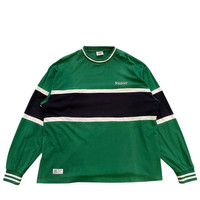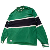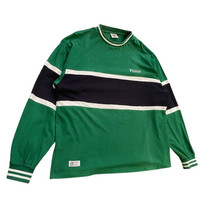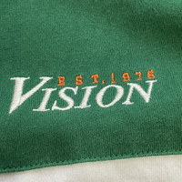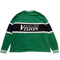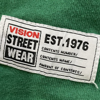 This is an authentic long-sleeve tee or rugby-style shirt from Vision Street Wear, a legendary brand established in 1976 that helped define 80s and 90s skate and street fashion. • Design & Vibe: This piece features a bold, color-block design in green, black, and white, with a striking large "VISION EST. 1976" graphic prominently displayed across the back (back hit). The front features a smaller Vision logo. This style perfectly captures the oversized, graphic-heavy look of vintage streetwear. • Fabric & Quality: The main body is primarily Cotton (82%) with some Polyester, ensuring a comfortable, breathable, yet durable feel. The ribbed cuffs and collar have a blend of Cotton, Polyester, and Polyurethane for stretch and shape retention. • Condition: [Insert your specific condition notes here, e.g., Excellent vintage condition, gently worn, or Minor fade to fabric consistent with age, etc.] • A Rare Find: A nostalgic piece of skate history that is perfect for collectors or anyone looking for an authentic vintage streetwear look. Measurements Pit 26inc Length 20inc Shoulder 23.5inc Sleeve Length 25inc