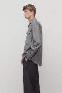 Oversized button-up shirt in virgin wool flannel with curved hem, buttoned patch pockets, and exposed front placket with button closure. More information - 100% Wool - Lined in 100% Cotton - Made in Italy - Style: 1085W4084GRY
