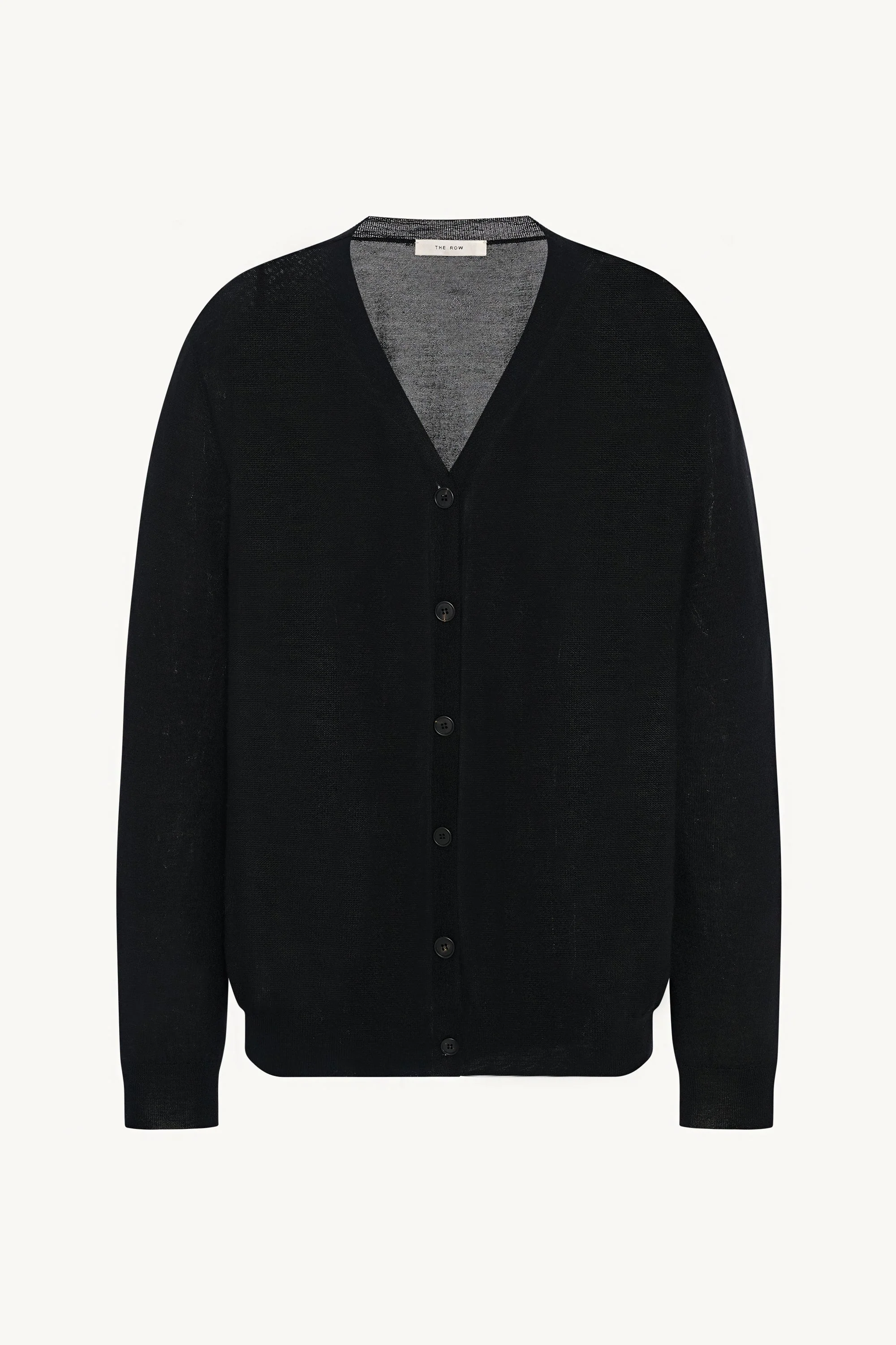 Boxy v-neck cardigan in featherlight worsted cashmere with horn button closure and ribbed neckline, cuffs, and hem. With an exceptionally fine structure and soft hand, the pure cashmere knit is ideal for seasonless layering. More information - 100% Cashmere - Made in Italy - Style: 10695Y498BLK