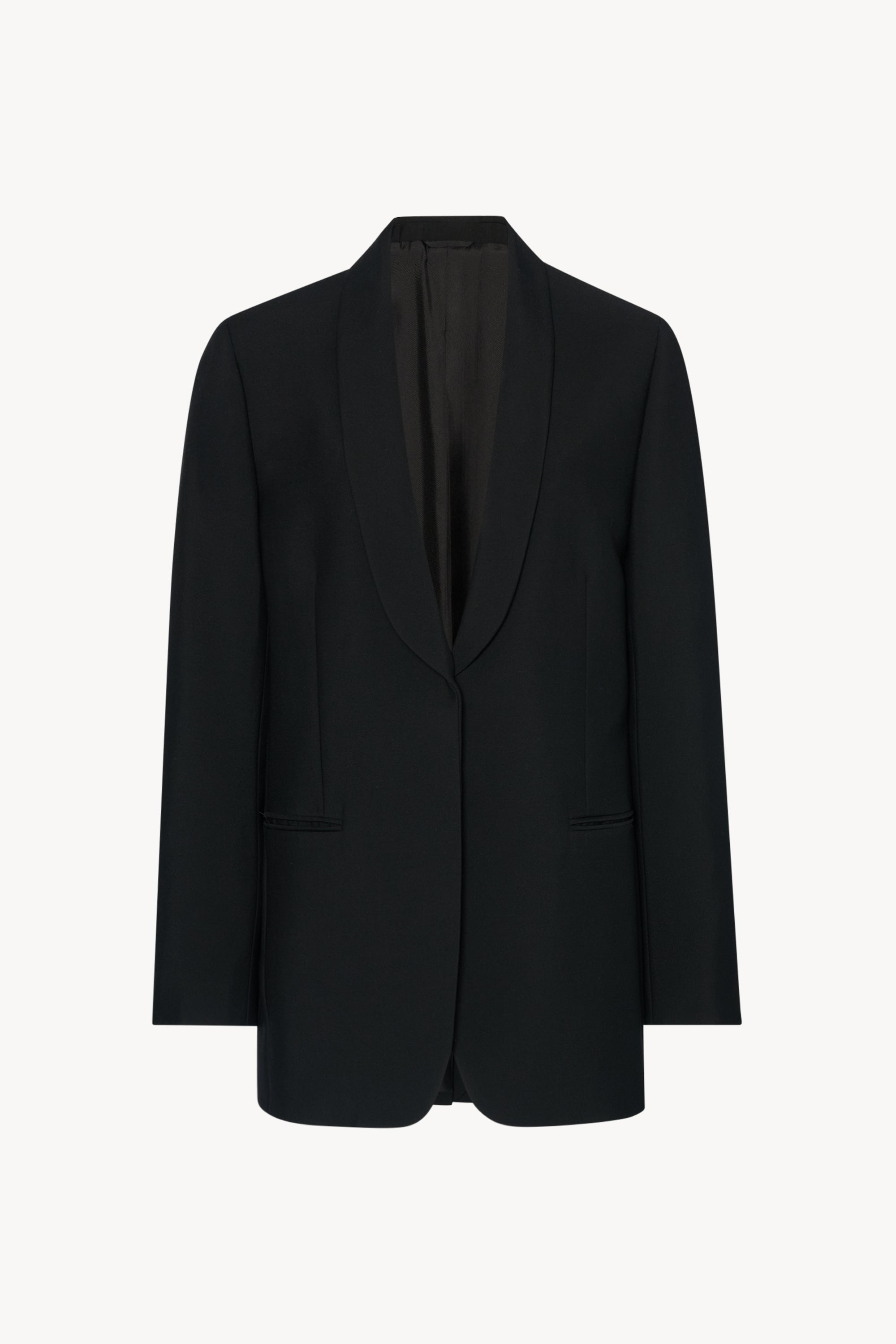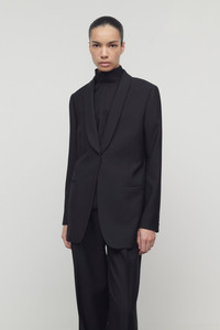 Single-breasted tuxedo jacket in fluid virgin wool with shawl lapel, front welt pockets, and interior satin ribbon closure. More information - 100% Wool - Lined in 100% Silk - Made in Italy - Style: 10135W2833BLK