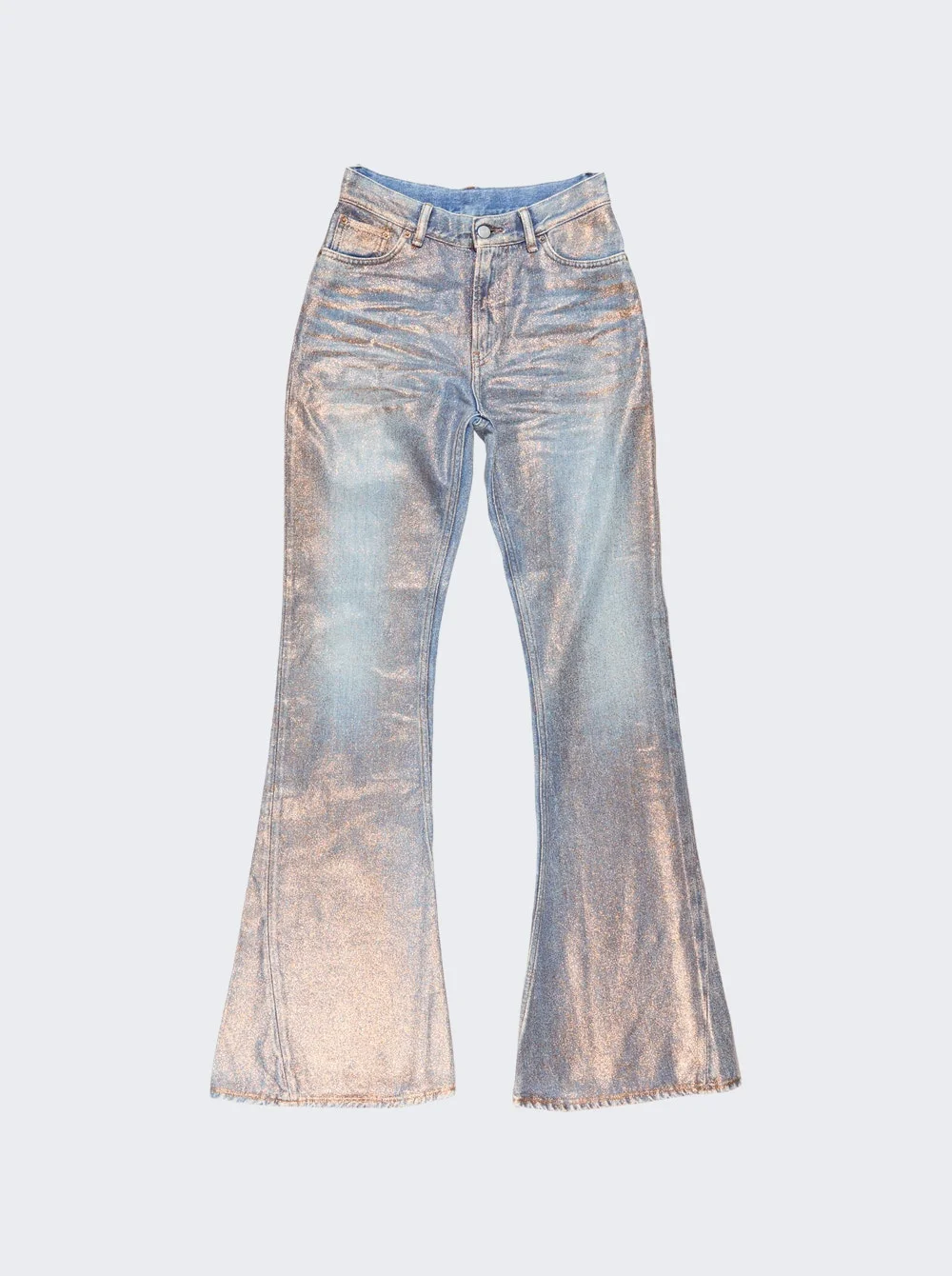 Details - Mid rise - Flare leg - Zip and button closure - Belt loops - 5 pocket design - Back leather logo patch - Glitter fading throughout - Care according to label - Material: 43% cotton, 43% viscose, 14% polyester Vendor Color Code: Brand Style: A00582 Designer/Brand: ACNE STUDIOS