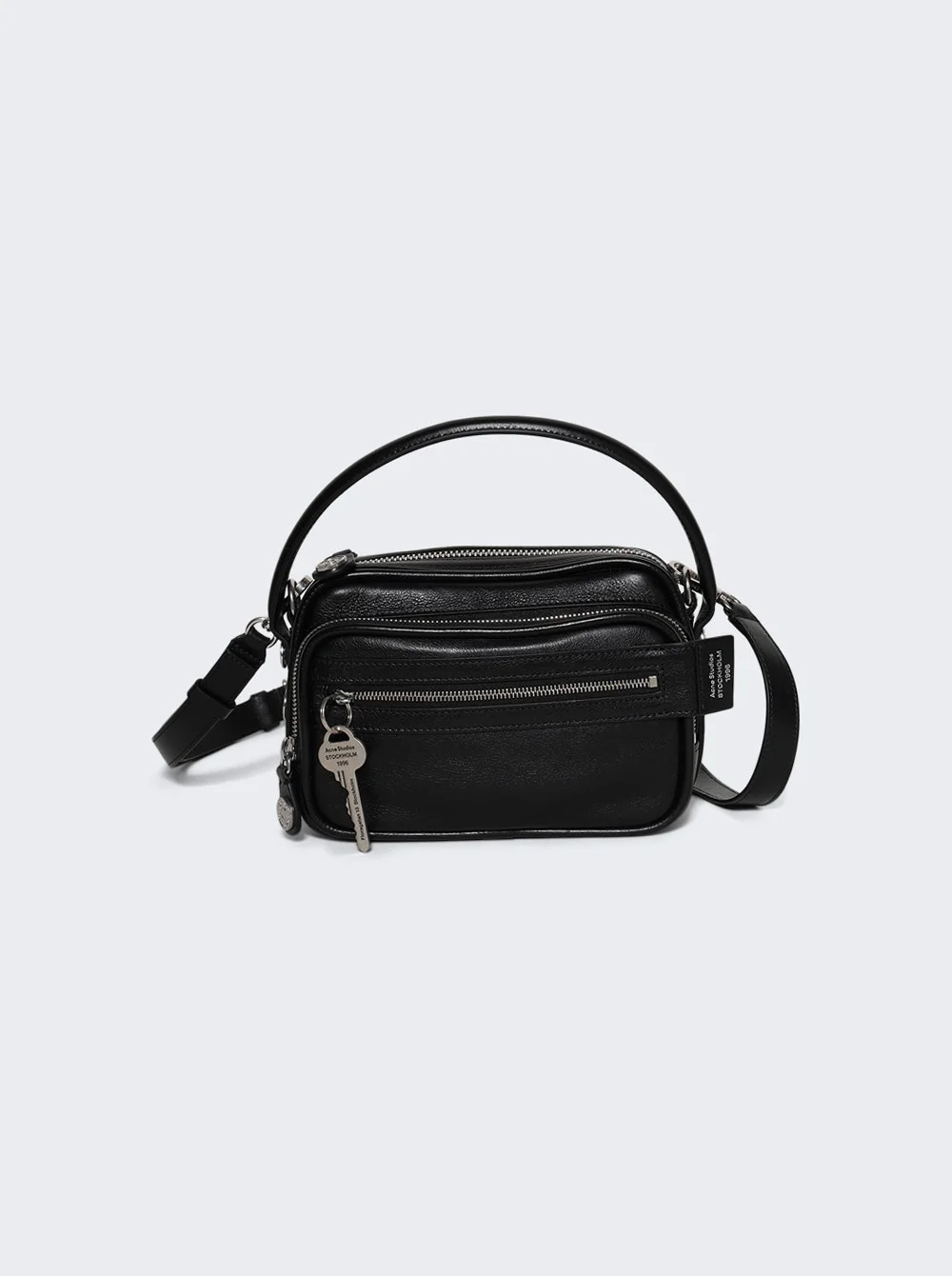 Details - Small crossbody bag in small grain shiny leather - Multi-pocket design, zip-compartments - Branded key charm - 1996 Acne Studios logo embossed in silver - Drop handle and adjustable crossbody strap - Silver-toned zip compartments and denim-style button details - Material: Calf Leather Size Information: Vendor Color Code: Brand Style: C10276 Designer/Brand: ACNE STUDIOS