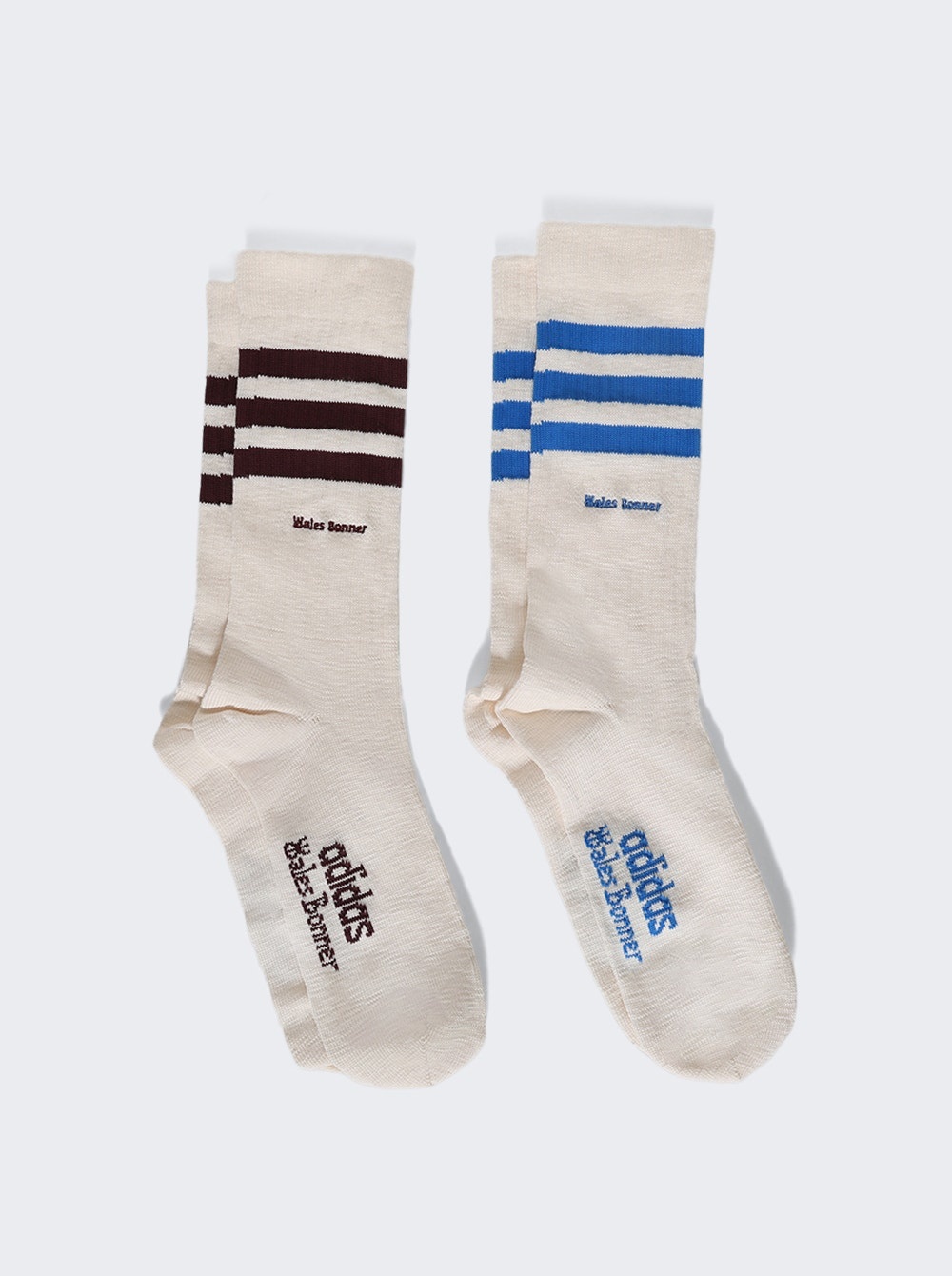 Details - Part of the Wales Bonner collection, inspired by collegiate sports and the American lifestyle, merging classic athleticism with timeless elegance. - Set of two chalk white crew socks in black and blue stripe - Embroidered Wales Bonner logo - Engineered three stripes on upper leg - Engineered Adidas-Wales Bonner logo on the bottom - Material: 79% Cotton, 18% Recycled Polyester; 2% Elastane, 1% Recycled Nylon Vendor Color Code: Brand Style: JV8683 Designer/Brand: ADIDAS