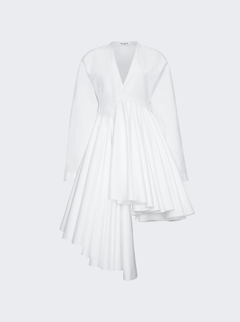 Details - Regular fit - Long sleeeves - Front V-neckline - Side slit pockets - Unlined - Asymmetrical pleated hem - Care according to label - Material: 100% Cotton Size Information: Vendor Color Code: Brand Style: AA9R2618T447A000 Designer/Brand: ALAIA
