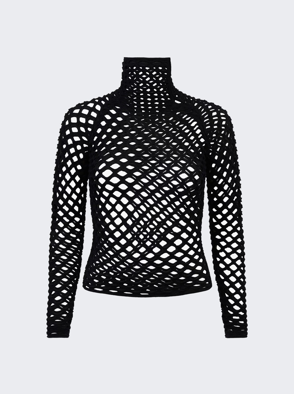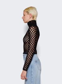 Details - Cage turtleneck sweater top - Long sleeves - Large 3D mesh with internal layer of lurex - Knitted in a felted wool Dimensions: Model is 5'9"/175cm and is wearing a size FR36 Composition: 40% viscose, 32% wool, 18% metallized polyester, 9% polyamide, 1% elastane Care: care according to label Brand Style: AA9S02364M821 Designer/Brand: ALAÏA