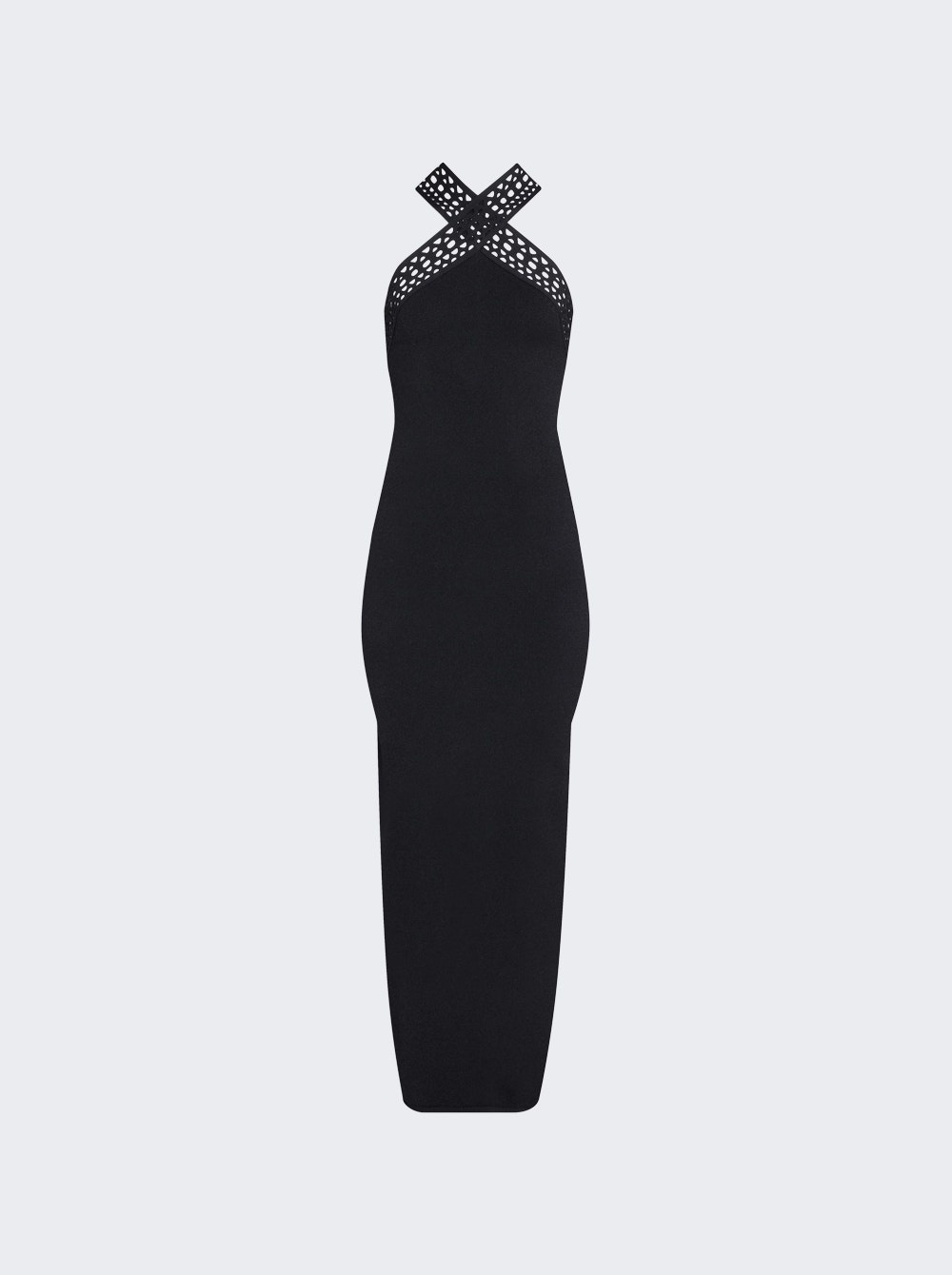 Details - Bodycon - Figure hugging - Open-back - Vienne cut-out detail with bands crossing around the neck and in the back - Midi length Dimensions: Model is 5'9"/175cm and is wearing a size FR36 Composition: 75% Viscose, 25% Polyester Care: Care according to label Brand Style: AA9R24396M774 Designer/Brand: ALAIA