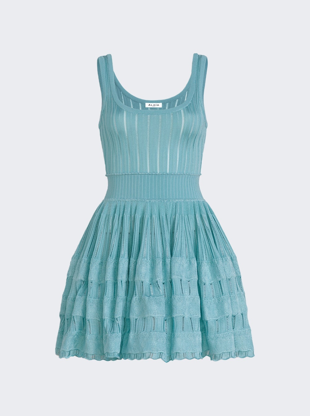 Details - Fitted fit - Sleeveless - Scoop neckline - Mini length - Banded waist - Scalloped hem - Care according to label - Material: Viscose, Polyamide, Elastane - Model is 5'9"/175cm and is wearing a size FR36 Brand Style: AA9R22462M712 Designer/Brand: ALAIA