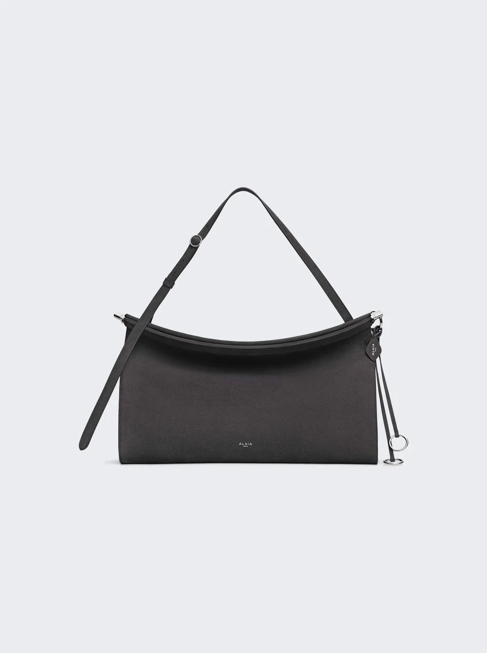Details - Large East West shoulder bag - Curved shape that hugs the body - Hinge opening system wrapped with leather - Signature folding detail on the bottom of the bag - Decorative ties with metallic rings - Adjustable strap for shoulder or cross body carry - Material: Nubuck calfskin leather Size Information: Vendor Color Code: Brand Style: AA1S01441CA214 Designer/Brand: ALAIA