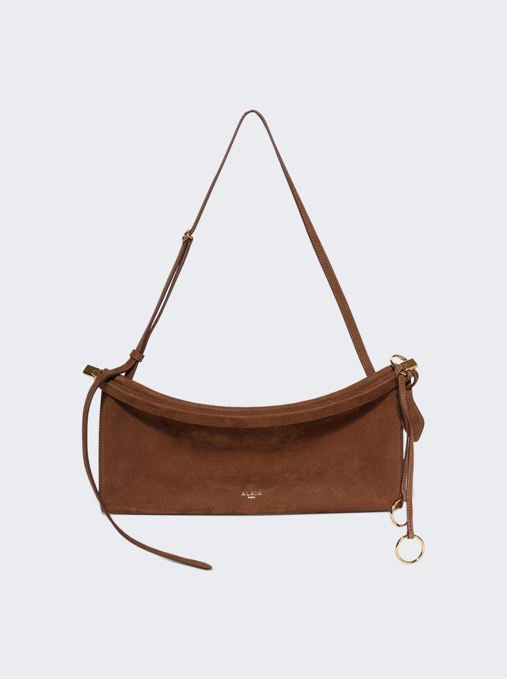 Details - East West curved bag that hugs the body - Hinge opening system wrapped with leather - Signature folding detail on the bottom of the bag - Decorative ties with metallic rings - Adjustable strap for shoulder and crossbody carry - Soft feel nubuck calfskin leather - Dimensions: L 30 X H 14 X D 9 cm / L 11.8 x H 5.5 x D 3.5 in - Material: 100% Calfskin Leather Brand Style: AA1S01430CA214731 Designer/Brand: ALAIA
