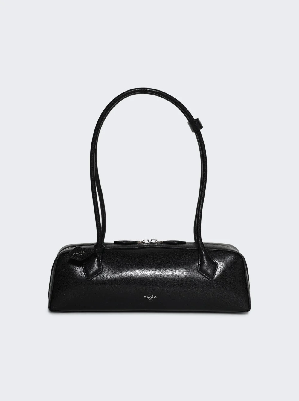 Details - Elongated shoulder bag in goatskin leather - Long tubular handles with decorative ties - Double zip closure - Small removable mirror on the inside pocket - Natural subtle grain, shiny finish - Material: 100% Goatskin; Lining: 100% Lambskin Size Information: Vendor Color Code: Brand Style: AA1S06033CA212 Designer/Brand: ALAIA