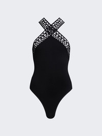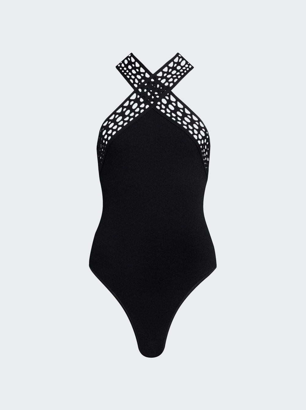 Details - Fitted fit - Bodysuit silhouette - Open back - Cross body straps - Vienne cut out detailing - Care according to label - Material: 70% VISCOSE, 23% POLYESTER, 5% POLYAMIDE, 2% POLYURETHANE - Model is 5'9"/175cm and is wearing a size FR36 Brand Style: AA9B02174M774 Designer/Brand: ALAIA