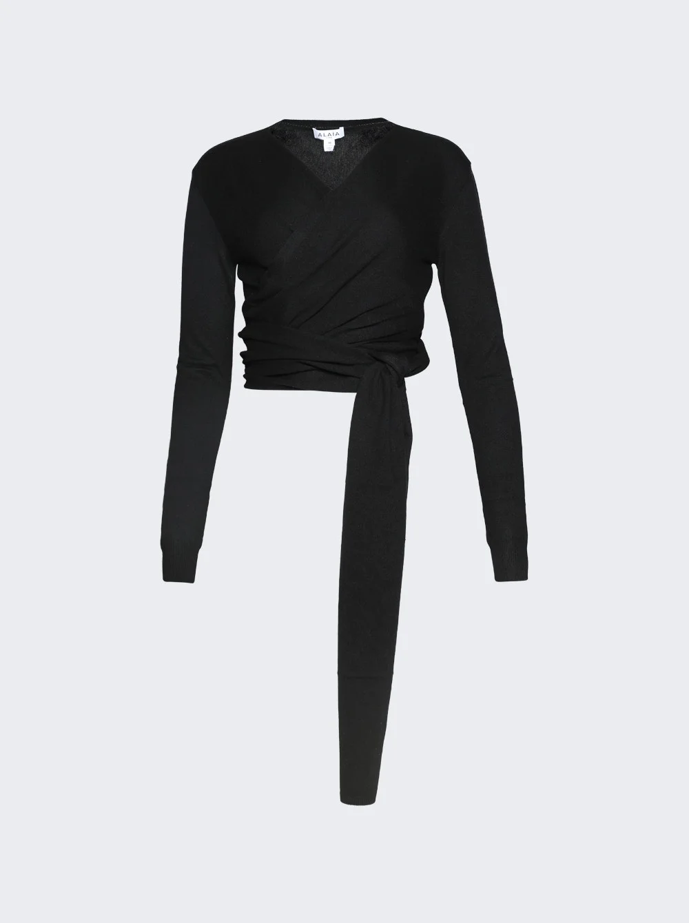Details - Regular fit - Long sleeves - Wrap design - Wide tie at the waist - Care according to label - Material: Wool and Cashmere Vendor Color Code: Brand Style: AA9S0368K144C Designer/Brand: ALAIA