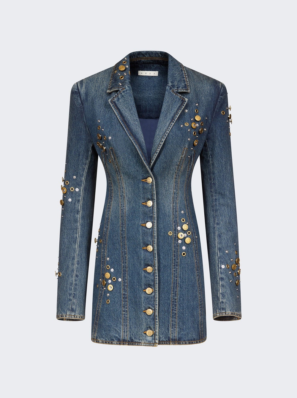 Crystal Button Studded Blazer Dress Dark Blue Wash