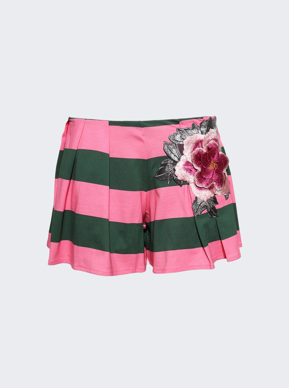 EMBROIDERED FLOWER RUGBY STRIPE PLEATED SHORT