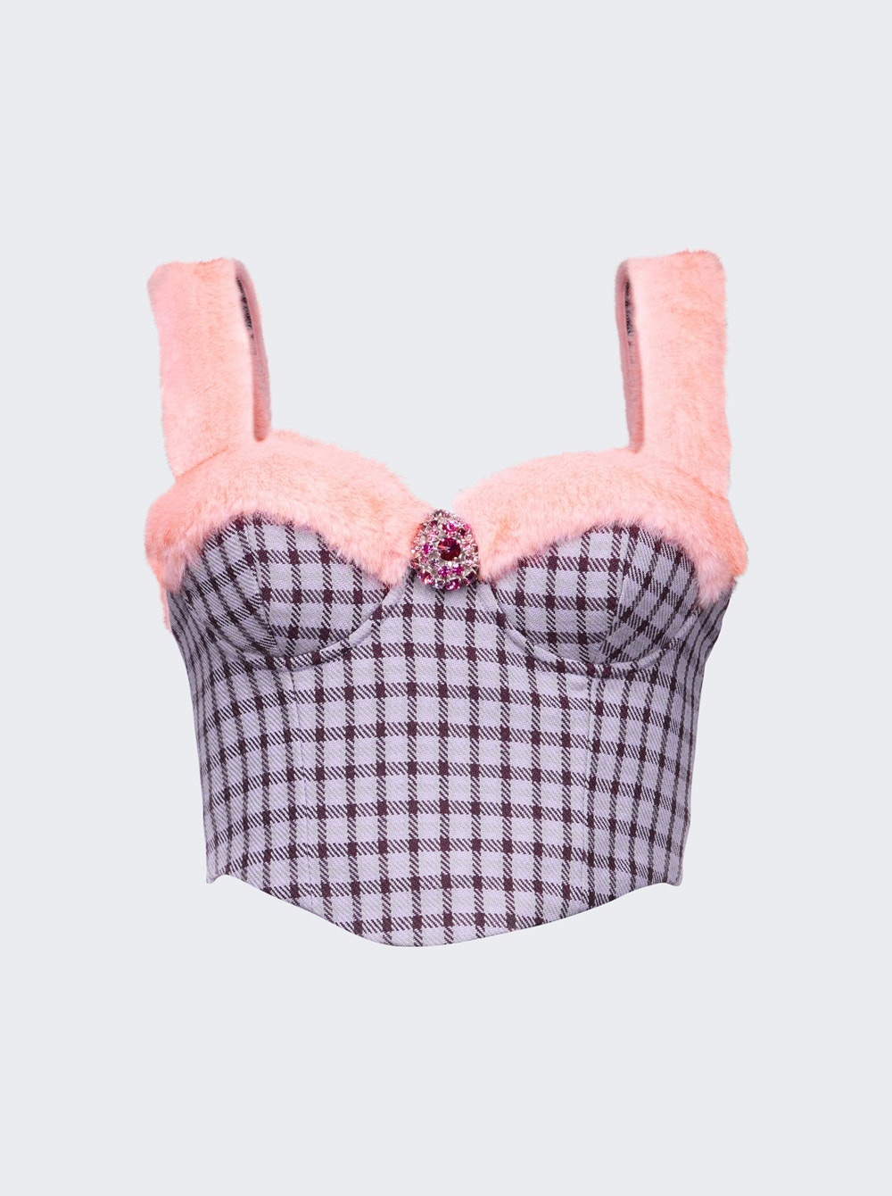 Details - Plaid wool bustier top - Crystal cluster button at center front - Faux fur trim - Adjustable straps Dimensions: Model is 5'9"/175cm and is wearing a size US4 Composition: 74% virgin wool, 26% cotton; lining: 100% viscose; faux fur combo: 100% polyester Care: care according to label Brand Style: 2304T12B234 Designer/Brand: AREA