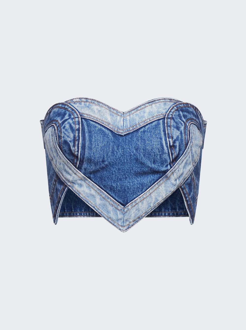 Details - Strapless - Denim patchwork heart detail - Exposed zipper on the back - Cropped fit - Asymmetric hem Dimensions: Model is 5'9"/175cm and is wearing a size US4 Composition: 100% Cotton Care: Care according to label Brand Style: PF24AWTP0026DE01 Designer/Brand: AREA