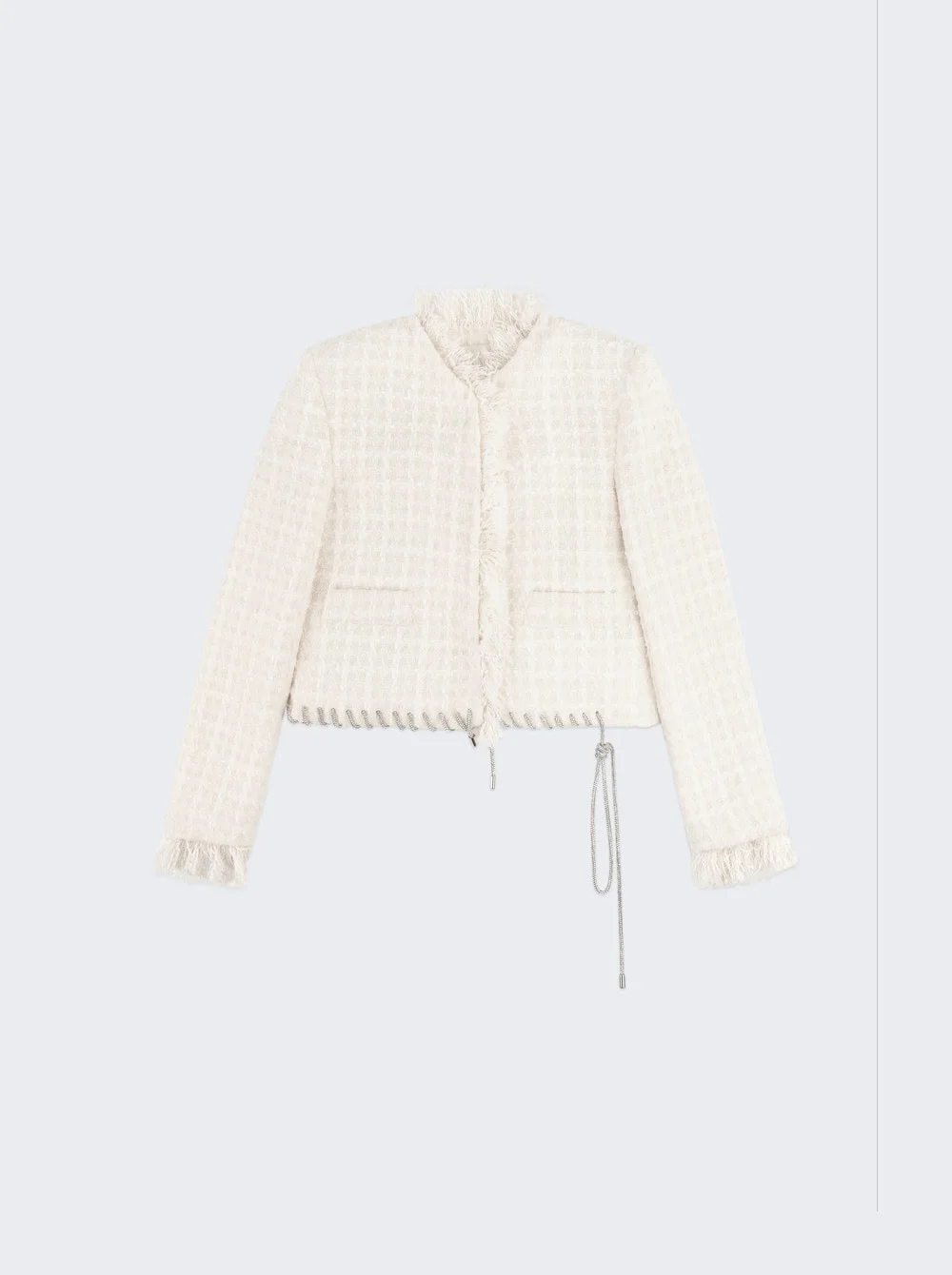 Details - Tweed jacket - Long sleeves - Frayed hems - Hook-and-eye closure - Front welt pockets - Crystal rope knot embellishment - Care according to label - Material: 30% Virgin Wool, 70% Polyester Vendor Color Code: Brand Style: RS26AWTA0039F A01 Designer/Brand: AREA