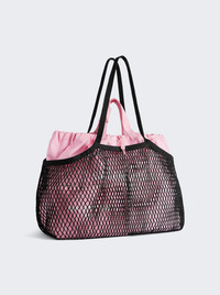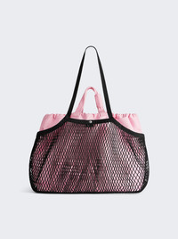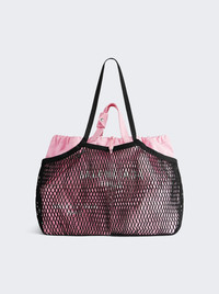 Details - Nylon and fishnet - Two handles hand carry - Two handles shoulder carry - Two separated compartments (interior nylon and exterior fishnet parts) - Balenciaga Paris logo printed at front and on the pouch - Drawstring to tighten top of bag - Inner zipped pocket - Removable pouch on the exterior bag Dimensions: 26.8 X 15.7 X 10.2 inches Composition: Fabric blend Care: Care according to label Brand Style: 791793 2AA46 Designer/Brand: BALENCIAGA