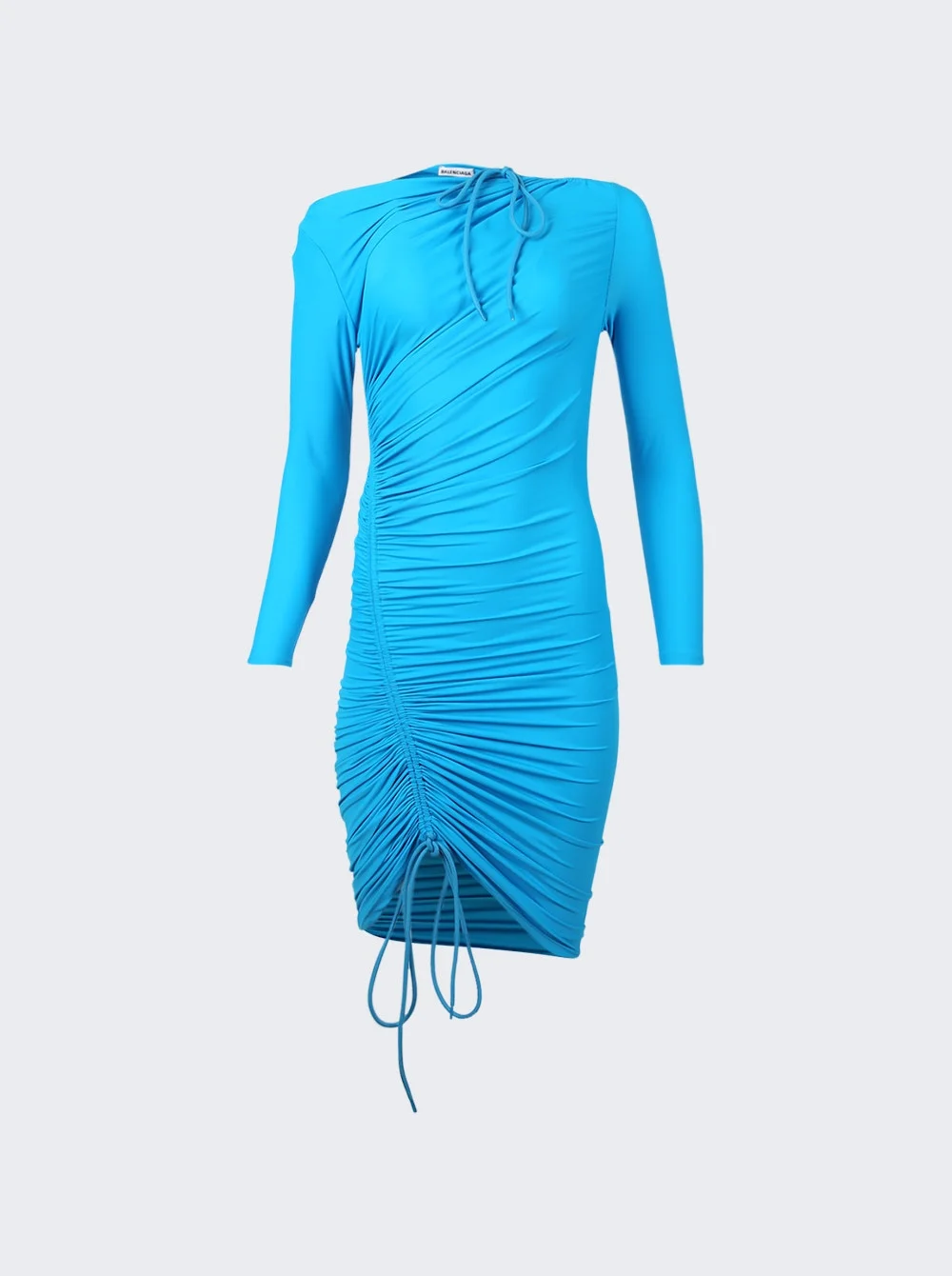 Details - Form-fitted silhouette. - Crew neckline. - Adjustable drawstrings at the neckline and hemline. - Strong shoulders. - Long sleeves. - Ruched details throughout. Dimensions: Model is 5'9"/175cm and is wearing a size FR38 Composition: 78% polyamide, 22% elastane Care: Care according to label Brand Style: 704440 TYK07 Designer/Brand: BALENCIAGA