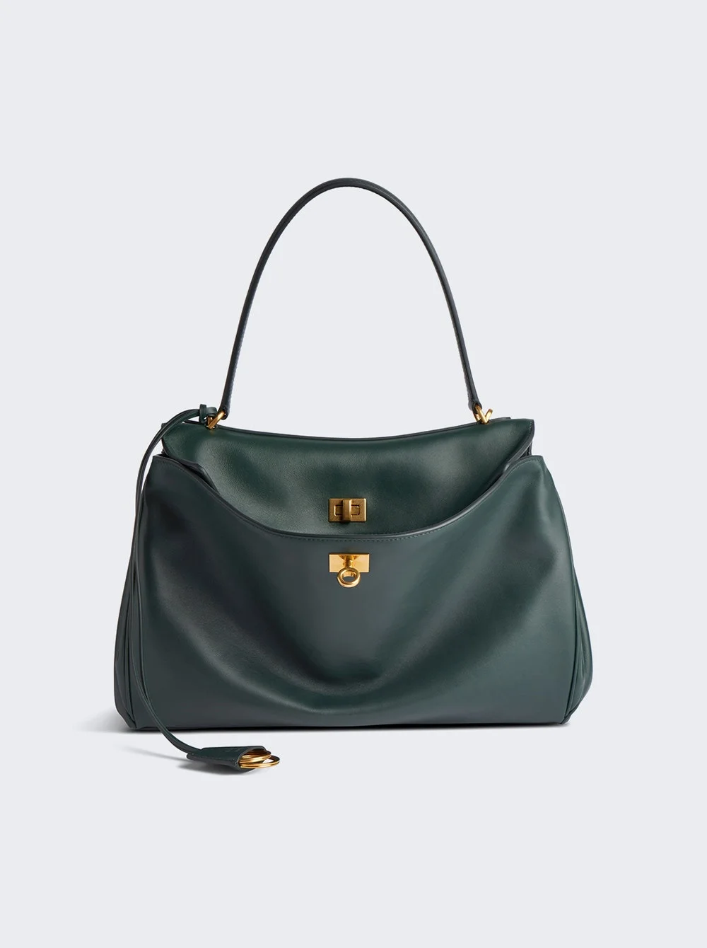Details - Smooth calfskin Rodeo bag - Aged-gold hardware - One handle (drop: 8.1in) - Removable shoulder strap (drop: 22.6in) - Removable cloche cles with two split rings - Turn lock closure - Wide front pocket - One main compartment - One inner zipped pocket and two flat pockets at back - Brass feet - Nappa lambskin lining - Main Material: Calfskin leather Size Information: Vendor Color Code: Brand Style: 789772 2AA4V Designer/Brand: BALENCIAGA