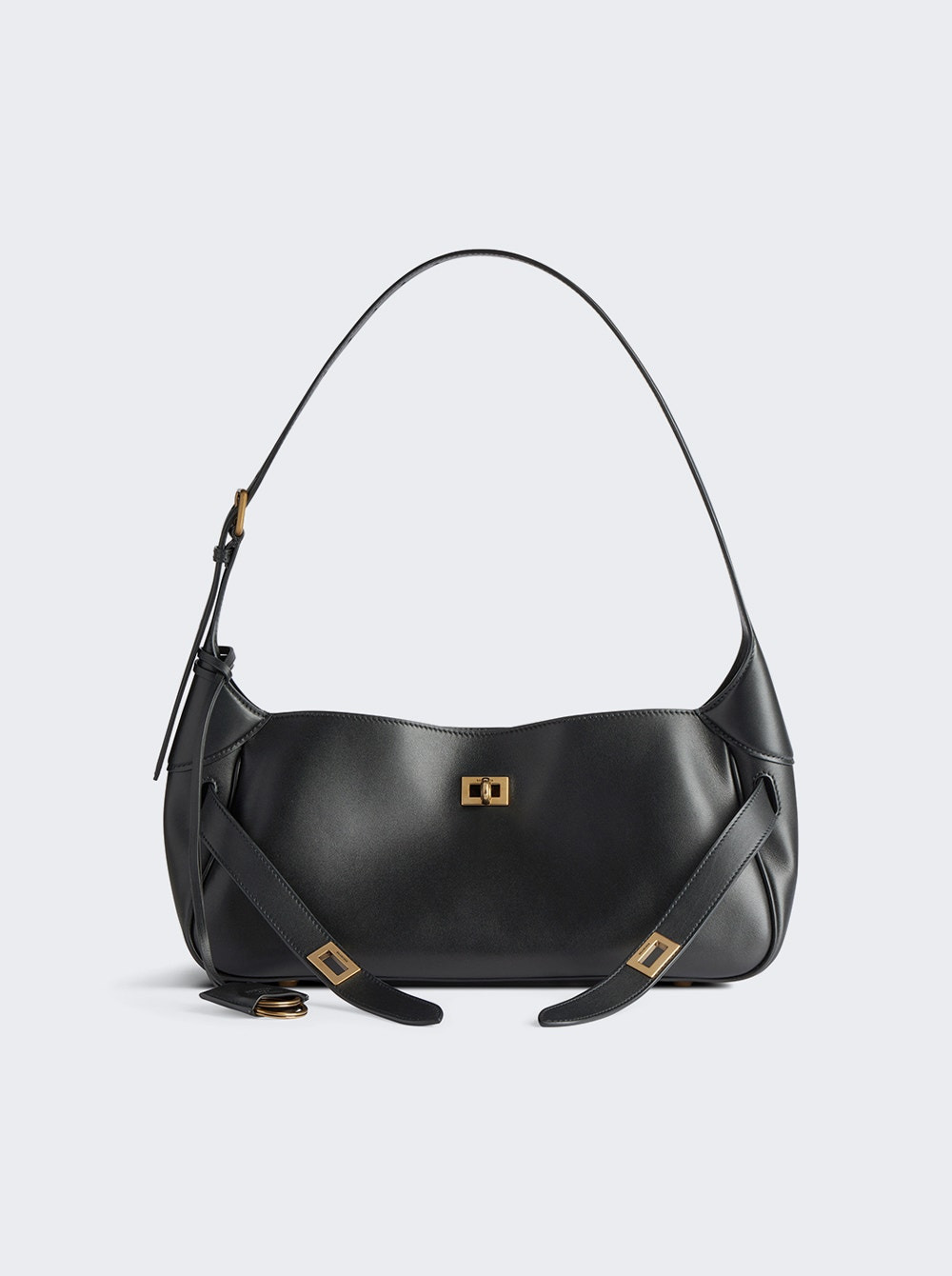 Details - Smooth calfskin shoulder bag - Aged-gold tone hardware - Adjustable shoulder strap (drop: 7.9in) - Removable cloche cles with two split rings - Turn lock closure and belts - Logo engraved on the closure system - One main compartment - One inner zipped pocket - Nappa lambskin bonded lining - Material: Calfskin leather Size Information: Vendor Color Code: Brand Style: 810680 2ABAV Designer/Brand: BALENCIAGA