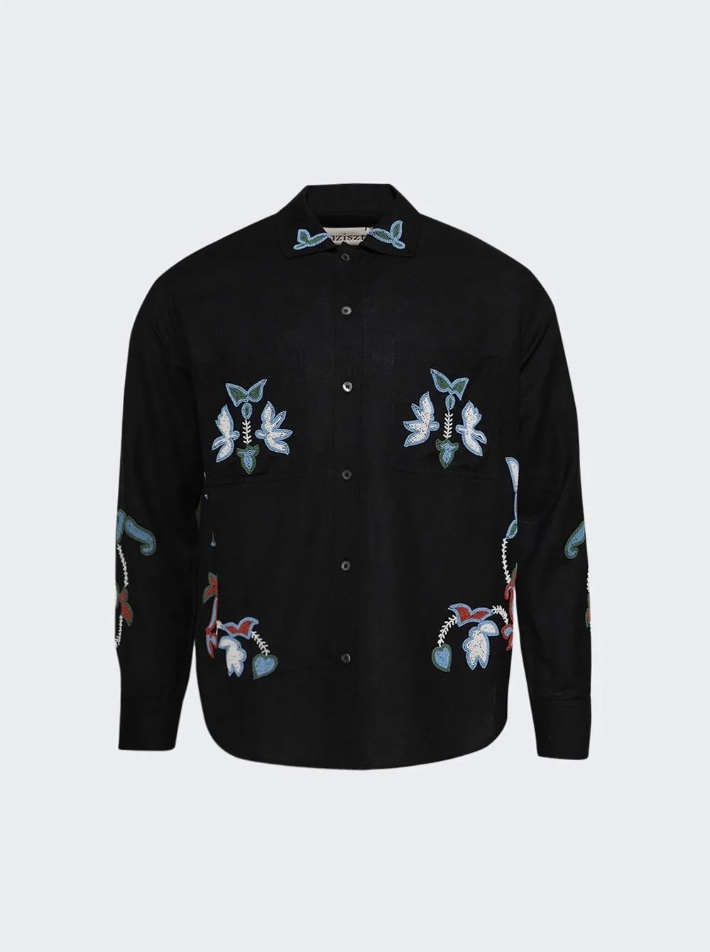 Details - Long sleeve black cotton shirt - Embroidered blue butterflies and flowers - Seed bead embroidery throughout - Material: 100% Cotton Size Information: Vendor Color Code: Brand Style: BZFW25SR33012 Designer/Brand: BAZISZT